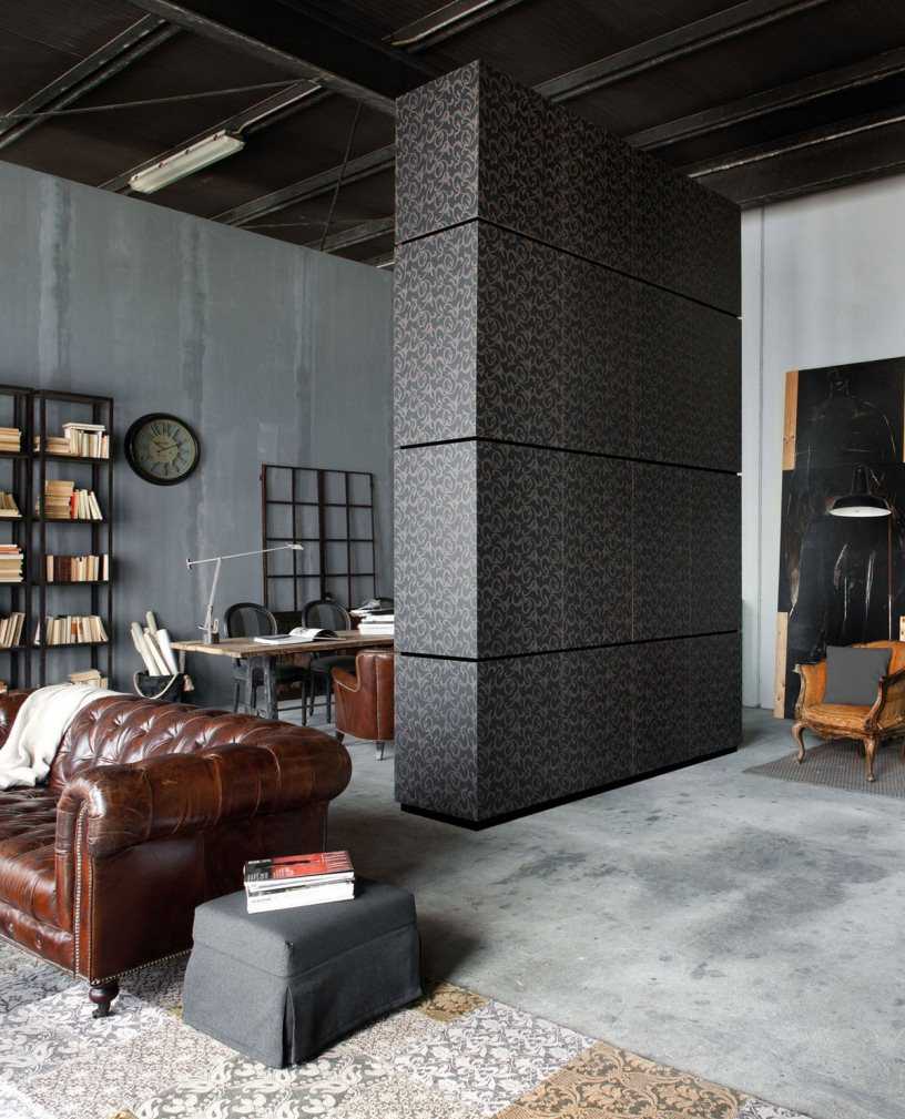 Для дизайнерского оформления в стиле лофт подойдет кожаная мебель, к примеру, диван, который можно поставить в спальне или кабинете для отдыха.