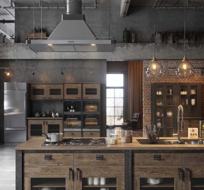 Центральной частью дизайнерского решения может стать большая медная вытяжка или спрятанные в стеклянном шкафчике увесистые устройства.