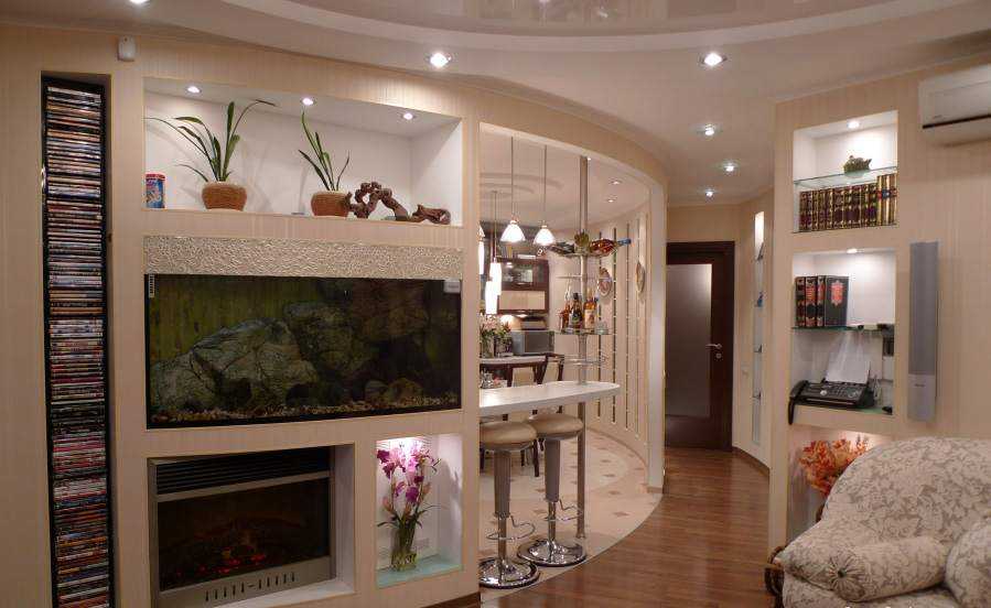 - Все чаще владельцы квартир, самостоятельно продумывающие дизайн, предпочитают прятать технику в углублениях. Кроме телевизора или стереосистемы, в нише отлично смотрится камин или аквариум.