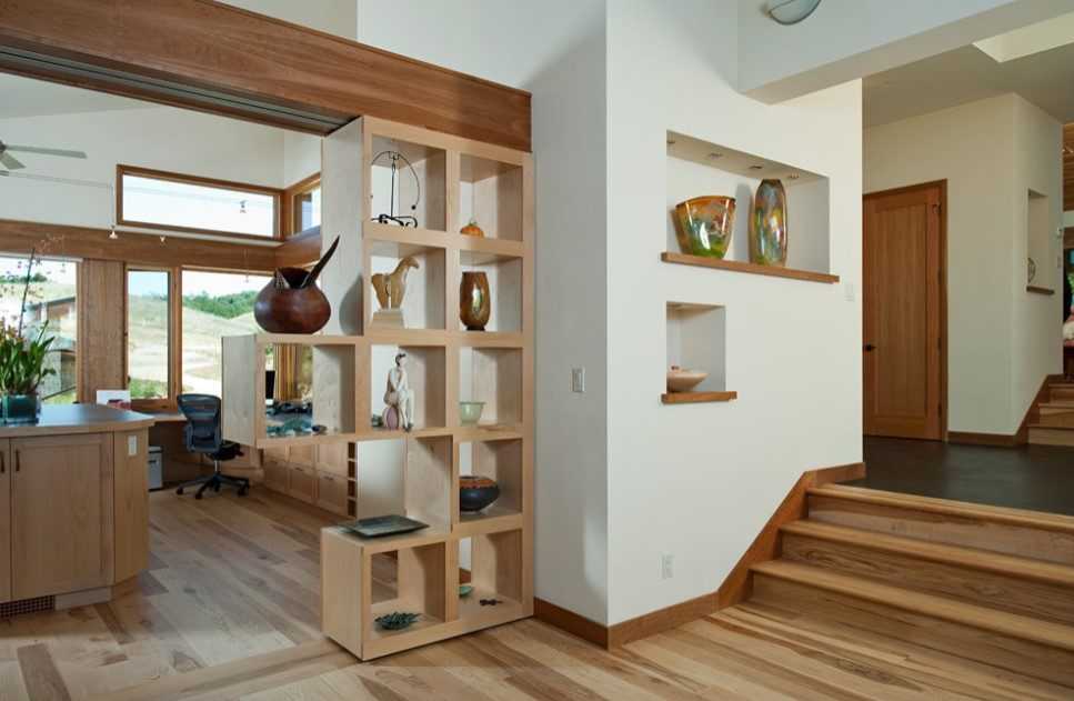 В прихожей или гостиной отлично будут смотреться горизонтальные открытые ниши. Чтобы сделать акцент на выбранной зоне, полки в светлом помещении стоит отделать темной древесиной. Подойдут они для хранения большого количества вещей. Но чтобы помещение не казалось более маленьким, не стоит слишком их захламлять.