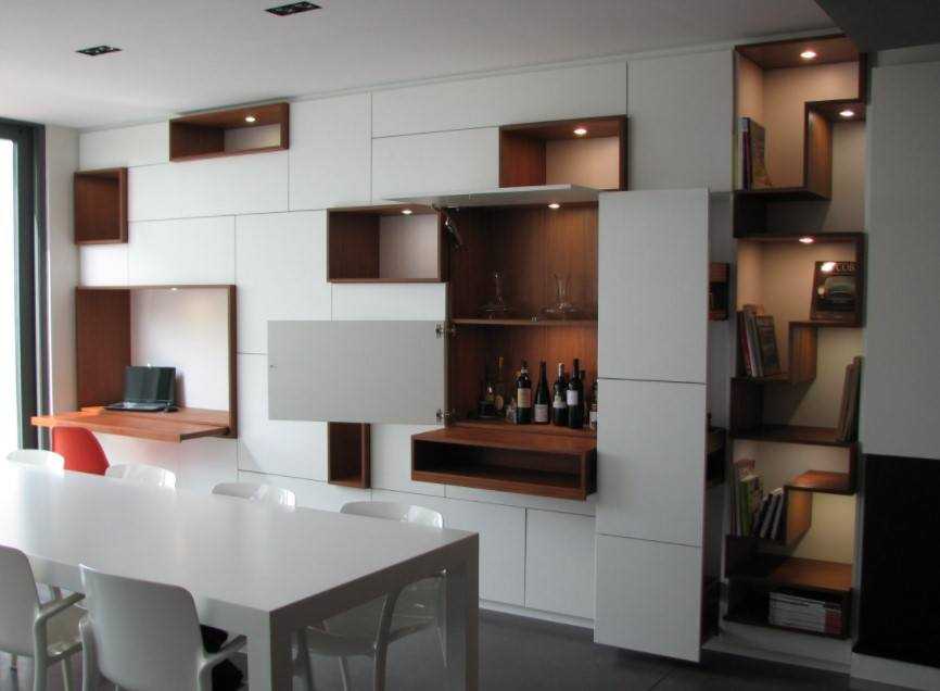 Утопленная в стену конструкция, может предоставить, как открытое, так и закрытое хранение одежды.При разделении углубления на секции, в них можно демонстративно расставить красивую посуду, изящные статуэтки или памятные сувениры.