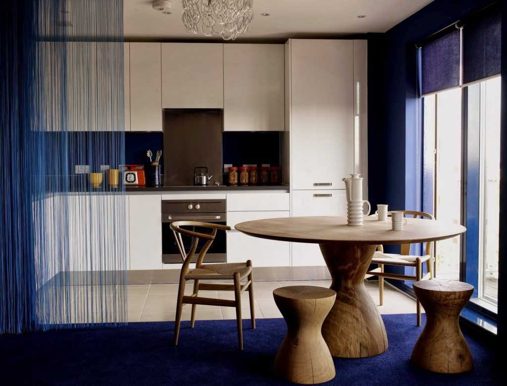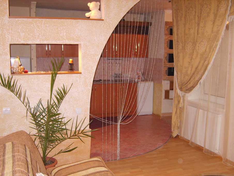 Большая кухня часто имеет декоративные архитектурные конструкции, которые эффектно дополнить, благодаря нитям. Арки, гостиные, столовые, рабочие зоны, а также квартиры-студии можно украсить благодаря нитям родственных тонов одного цвета. Свет, проходящий сквозь нити, создает атмосферу царственности и гармонии. Такой приём удачен в классических и смешанных интерьерах.