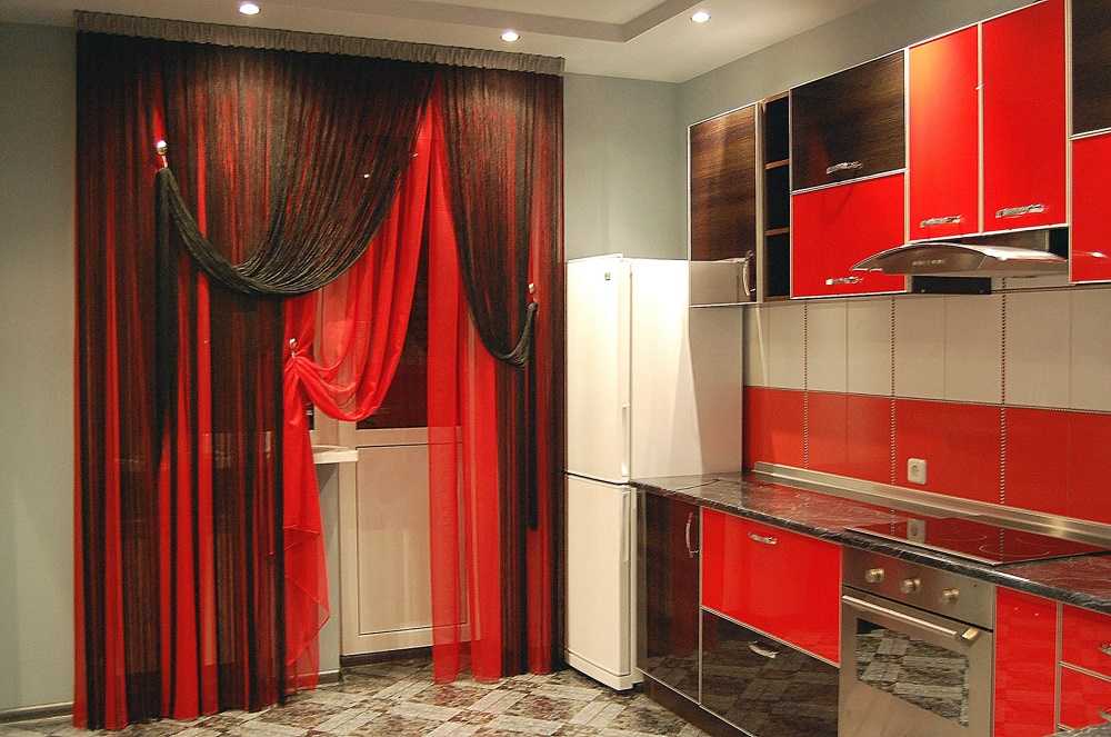 Сделать кухонный дизайн более изысканным помогут кисея из спиральных верёвок или радужные шторы с плавным цветовым переходом. Занавеска может быть как однотонной, так и многоцветной.