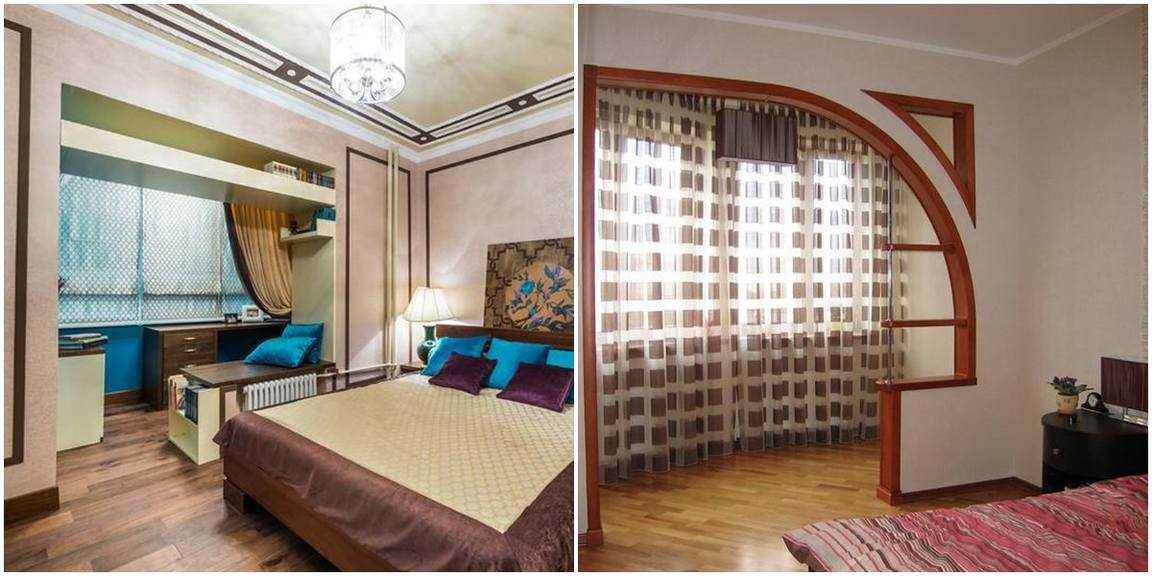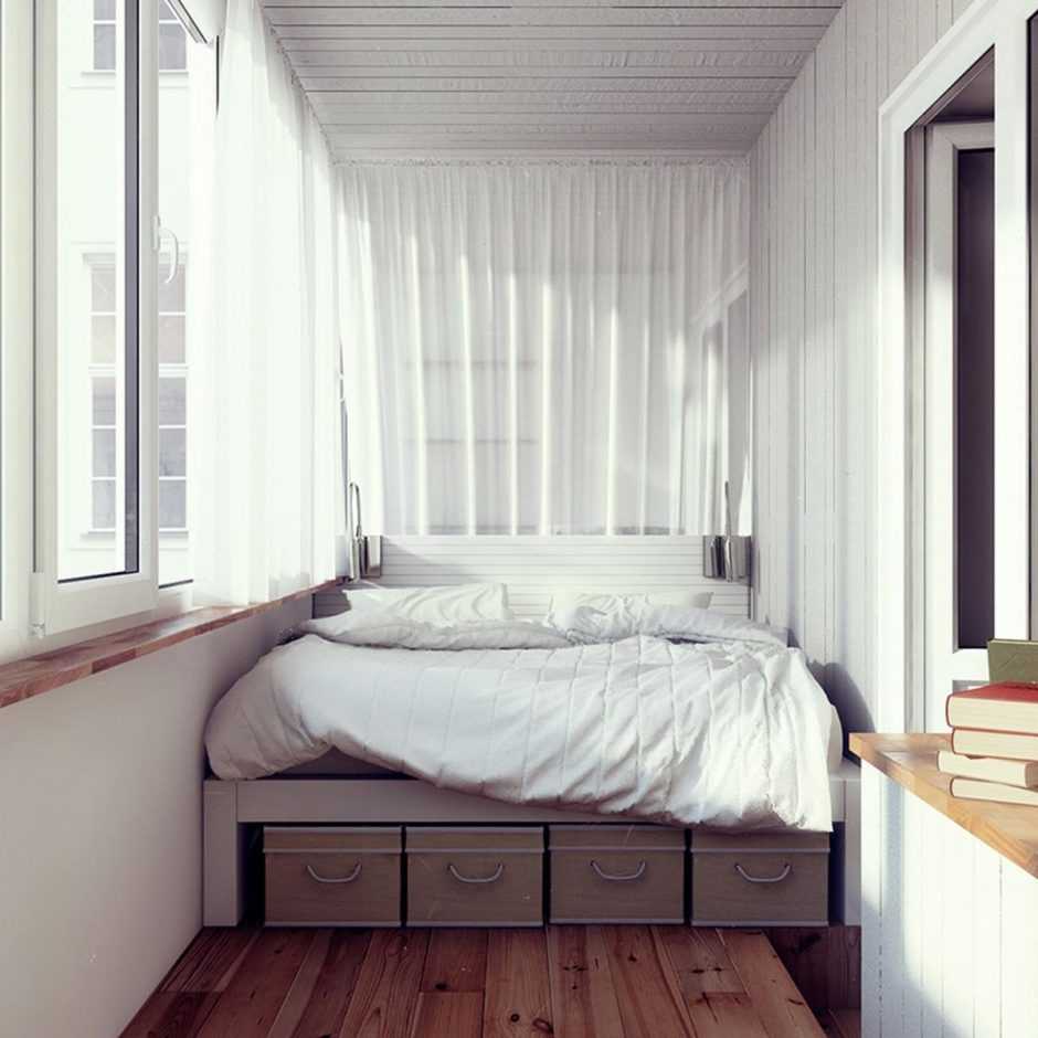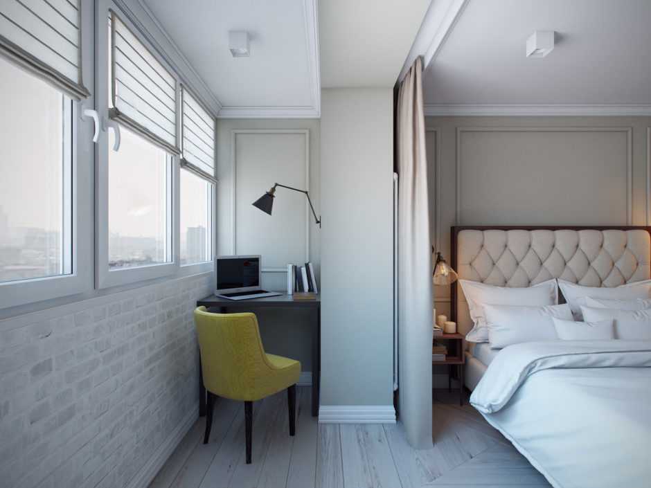 Если лоджию присоединить к небольшой спальне — это расширит помещение. Сделать это намного проще, чем объединять между собой другие помещения.Спальную зону при необходимости можно изолировать шторой, или перегородкой, легким декоративным панно.