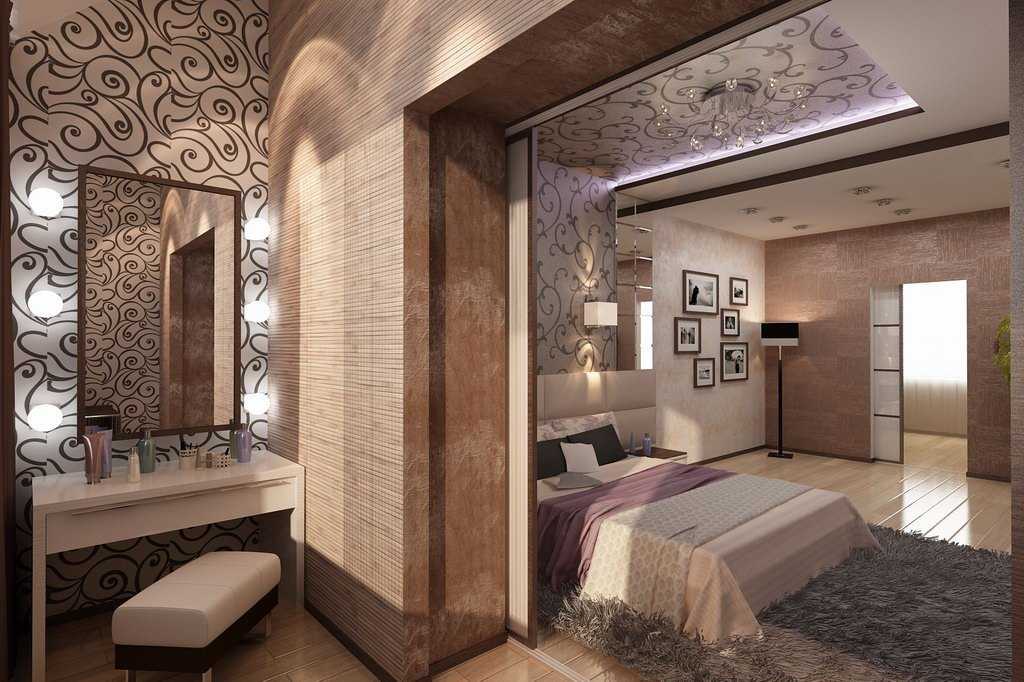 Наличие двух глухих стен позволит разместить вдоль них пару шкафов купе с зеркальными дверями. Последние помогут не только привести себя в порядок, но и сыграют корректирующую пространство роль.