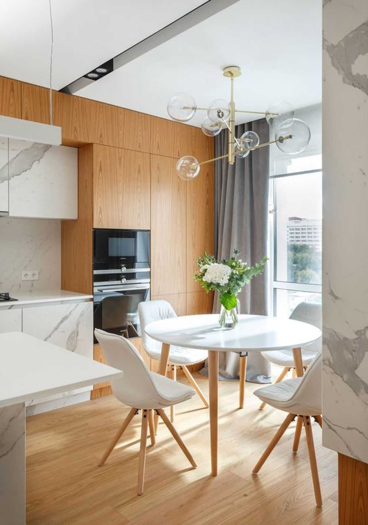 В кухне должно быть много света, поэтому важно сделать максимально ярким основное освещение. Также можно выделить каждую функциональную зону светильниками