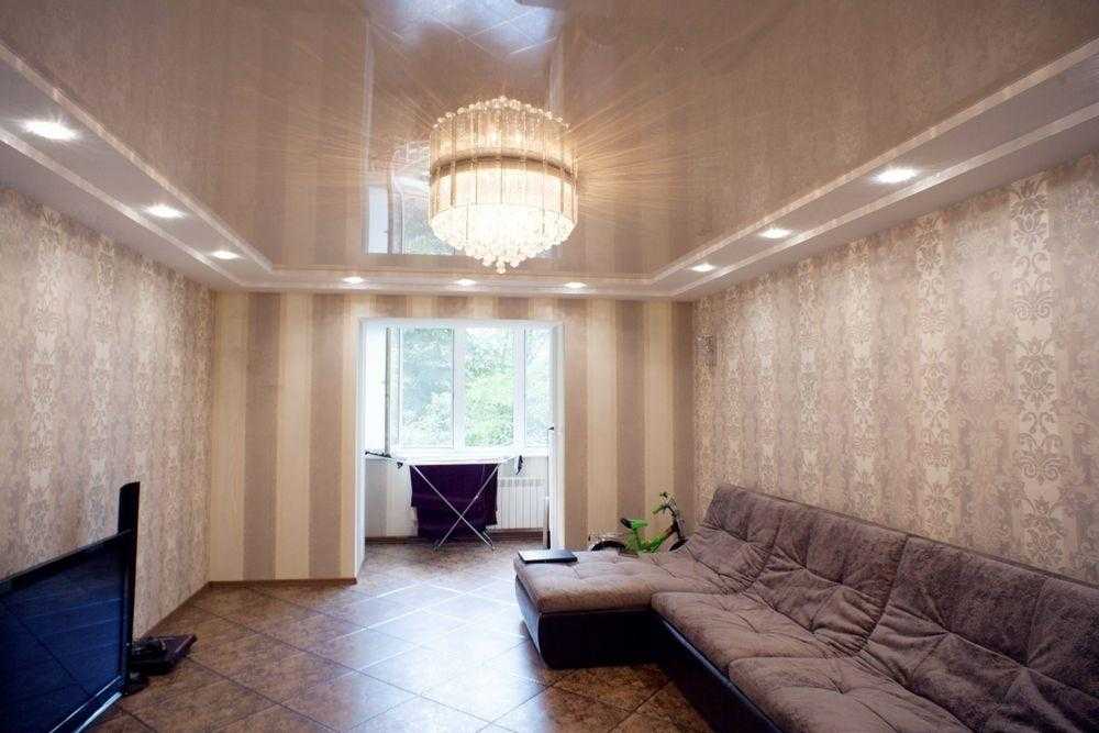 В маленькой гостиной глянцевый натяжной потолок добавит света и объема