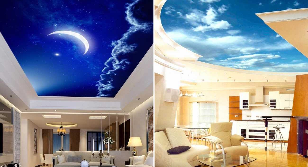 Любители тематических интерьеров наверняка оценят потолки с фотографиями природы, неба или птиц. А лаконичные витые узоры, вензеля или растительные мотивы скрасят отсутствие резьбы и лепнины в классических интерьерах.
