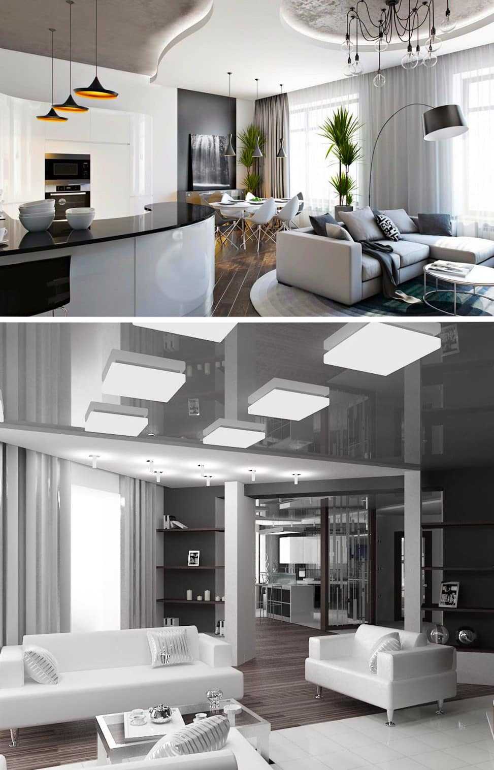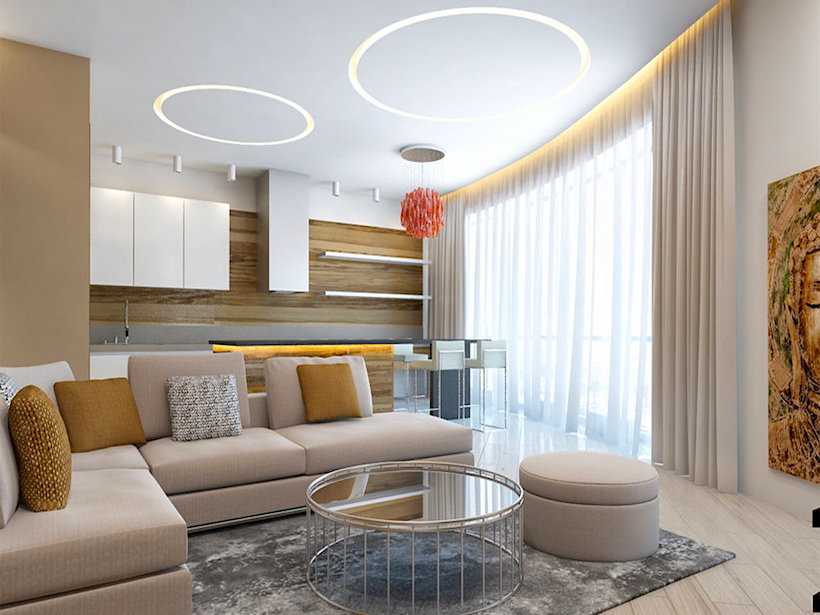 Разноуровневые конструкции прекрасно справятся со зрительным зонированием кухни, совмещенной с гостиной. С помощью перепадов высоты, разной цветовой гаммы, фактуры или освещения получается гармонично разделить пространство в студии.