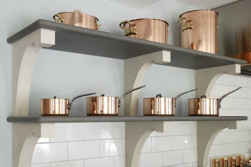 Главное при выборе полки — найти такую фактуру, которая будет гармонировать с общим интерьером кухни. Например, стальные глянцевые полки подойдут только для современных стилей вроде фьюжн, минимализм, хай-тек.