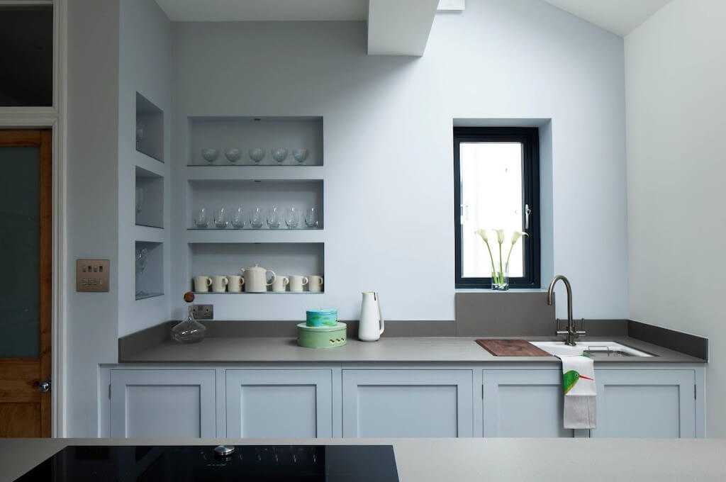 - На сами открытые полки (хотя бы нижние) стоит ставить только ту посуду, которая часто используется — так поверхность не будет загрязняться и пылиться, а тарелки с чашками периодически будут протираться.