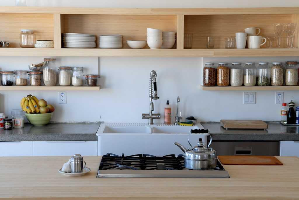 Открытые полочки помогают хозяйке не хранить ненужную утварь, как правило, ее хранят в самых дальних шкафах, здесь же такой возможности нет, значит, неиспользуемое годами не будет храниться дома.