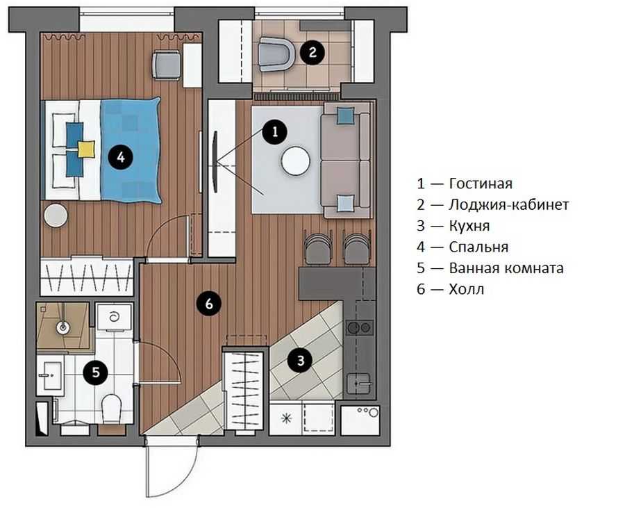 Функциональный интерьер с достаточно большой спальной комнатой, кухне-гостиной и рабочим кабинетом на утепленной лоджии