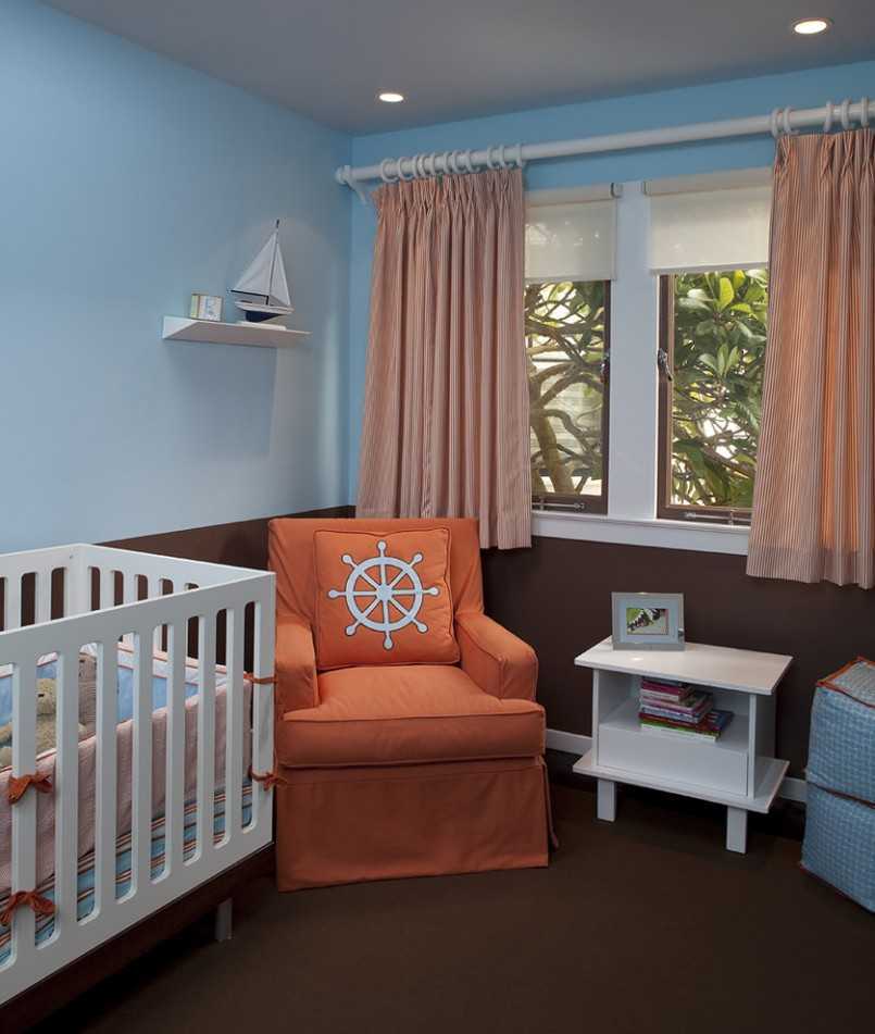 - Голубой. Он редко используется в сочетании с персиком. Однако такой цвет может быть успешно применен для придания комнате морского или романтичного стиля.