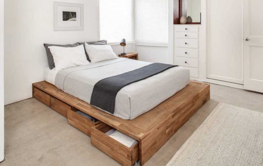 Обрати внимание на высокие кровати-подиумы со встроенными ящиками и модулями для хранения вещей и спальных принадлежностей