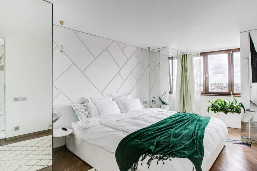 Для всех любителей обилия света подойдёт дизайн-проект спальни в современном стиле. Именно он предполагает возможность применения зеркал по краям изголовья, углам и стенам комнаты. Этот приём позволяет визуально изменять геометрию для маскировки выступов и углов.