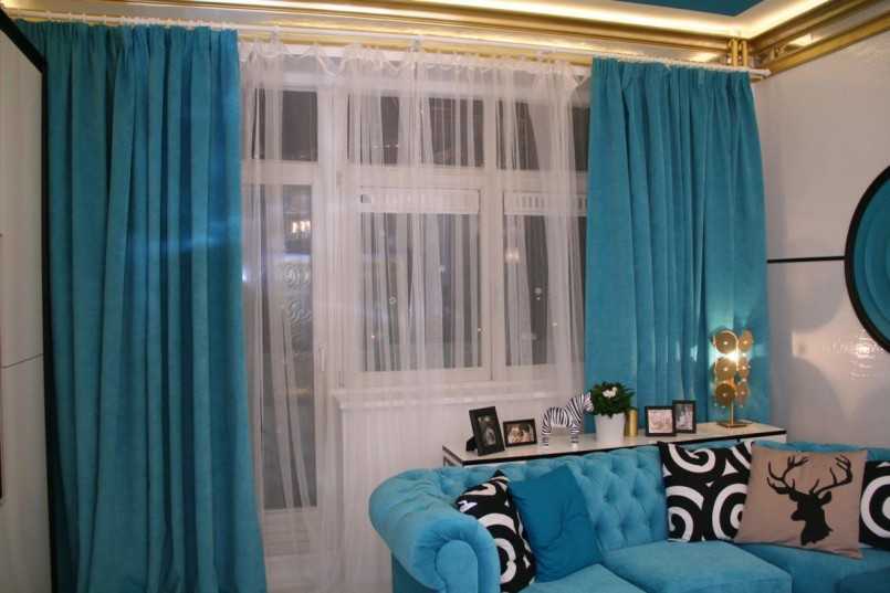 Многоцветные конструкции обычно делают из прозрачных тканей. Для такого приема нужно приобрести многоярусный карниз. Оттенки штор должны сочетаться между собой. Например, удачным сочетанием считается комбинация белых и синих занавесок.