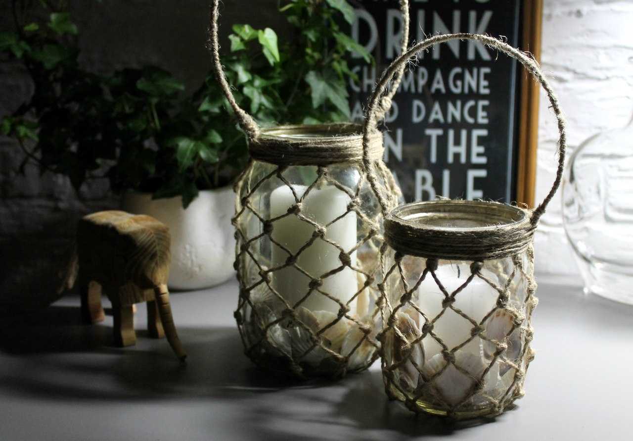 Этот вариант тоже достаточно прост в исполнении. На дно банки устанавливают свечку (альтернативный вариант – свечи-таблетки, они легкие и не нуждаются в закреплении) и присыпают песком. По периметру банки вокруг свечи можно выложить красивые ракушки, морские звезды, цветные и стеклянные камушки. Последний штрих — бечевка, обмотанная несколько раз вокруг горлышка и завязанная бантиком.