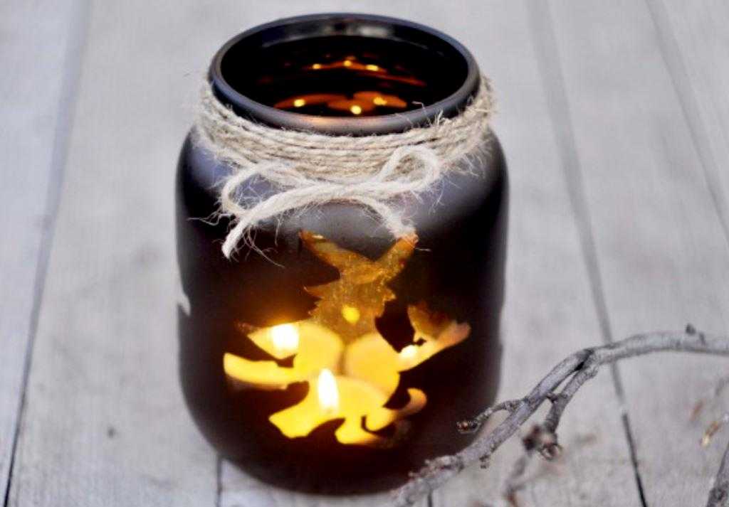 Оклеенную банку необходимо оставить на несколько часов до полного высыхания, а затем обработать спрей-лаком для лучшей фиксации. Украсьте горлышко банки-подсвечника красивой лентой или бечевкой, разместите внутри свечку и наслаждайтесь красотой осеннего заката у себя дома.