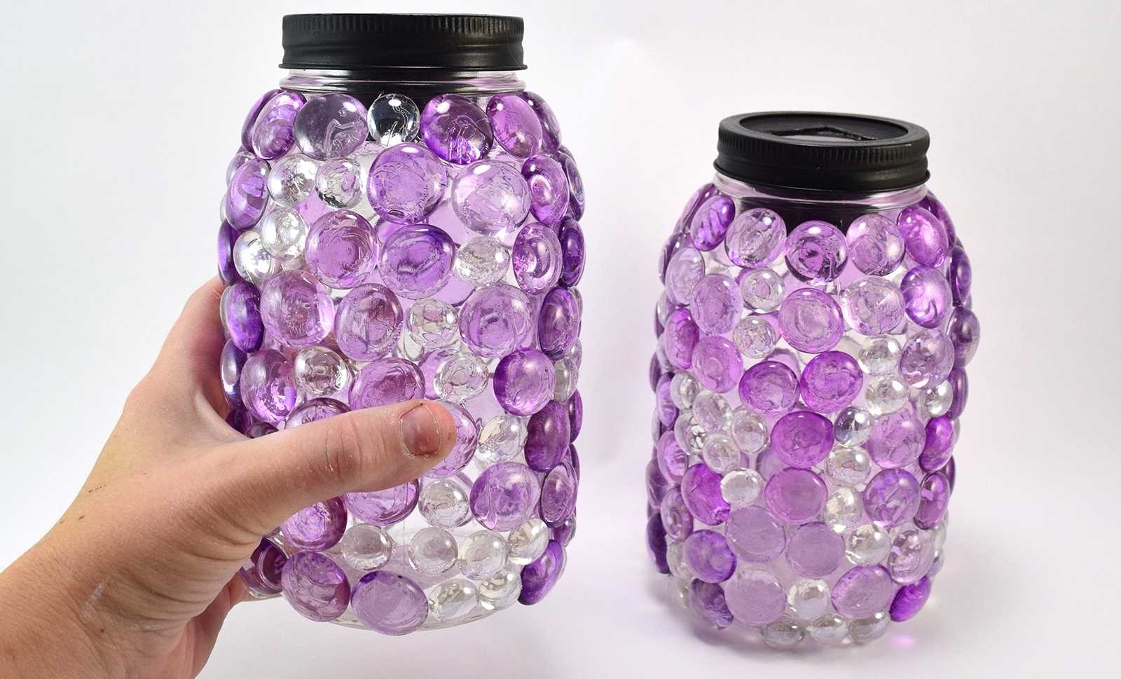 Электрическая свеча приклеивается к крышке банки, крышка закручивается на банке, и взору предстает стильный светильник.