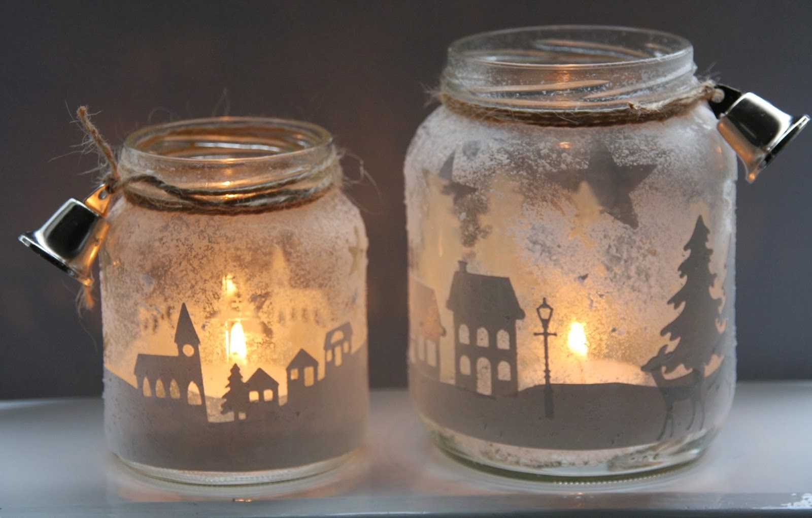 Силуэты на стекле наполнят комнату сказочными тенями, а в саду создадут атмосферу волшебства. В качестве сюжета выберите новогодний (снеговик, сугробы, Дед Мороз, мчащийся на санях) или любой другой (городские и деревенские пейзажи, цветы). Трафарет можно найти в сети и распечатать либо изготовить своими руками. Будущий силуэт обводят по трафарету на плотной бумаге, рисунок вырезают и наклеивают вокруг банки по внешней стороне. Когда внутри окажется свеча, она подсветит выбранный сюжет изнутри, как на фото ниже, и вы окажетесь словно в волшебном театре теней из детских сказок.