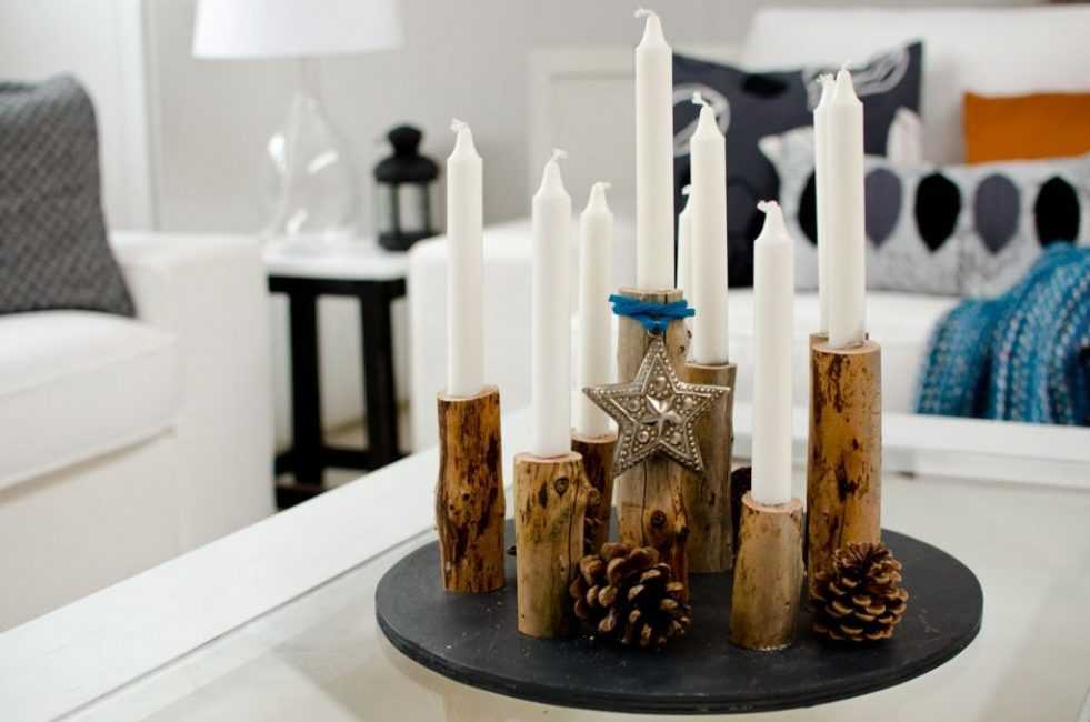 Толстую ветку можно и не распиливать, а сделать из нее подставку для нескольких свечей. Для этого нужно положить ее горизонтально и по всей длине сделать несколько углублений для небольших свечей. Такая подставка будет идеальным украшением для стола, а также замечательно будет смотреться над камином.