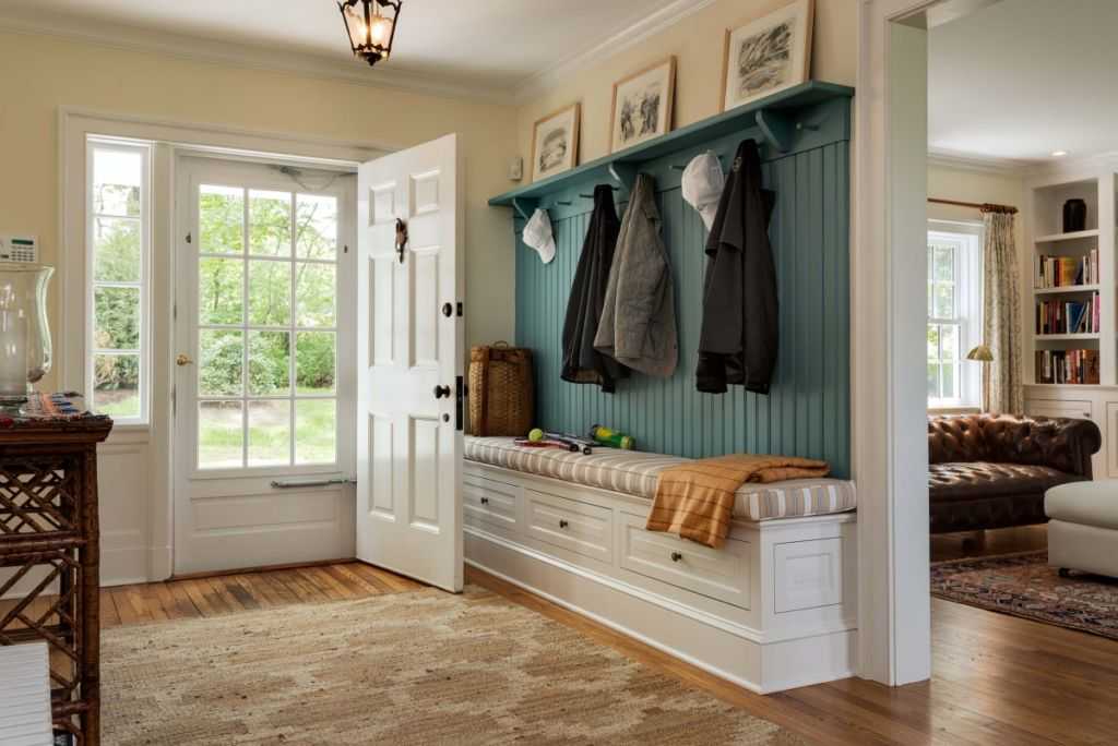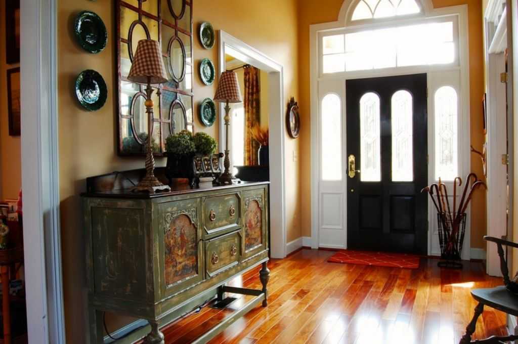 - Прихожая начинается с входной двери, поэтому она должна быть только деревянной. Ее цвет должен быть любых пастельных оттенков или выбеленный синий, малиновый, оливковый.