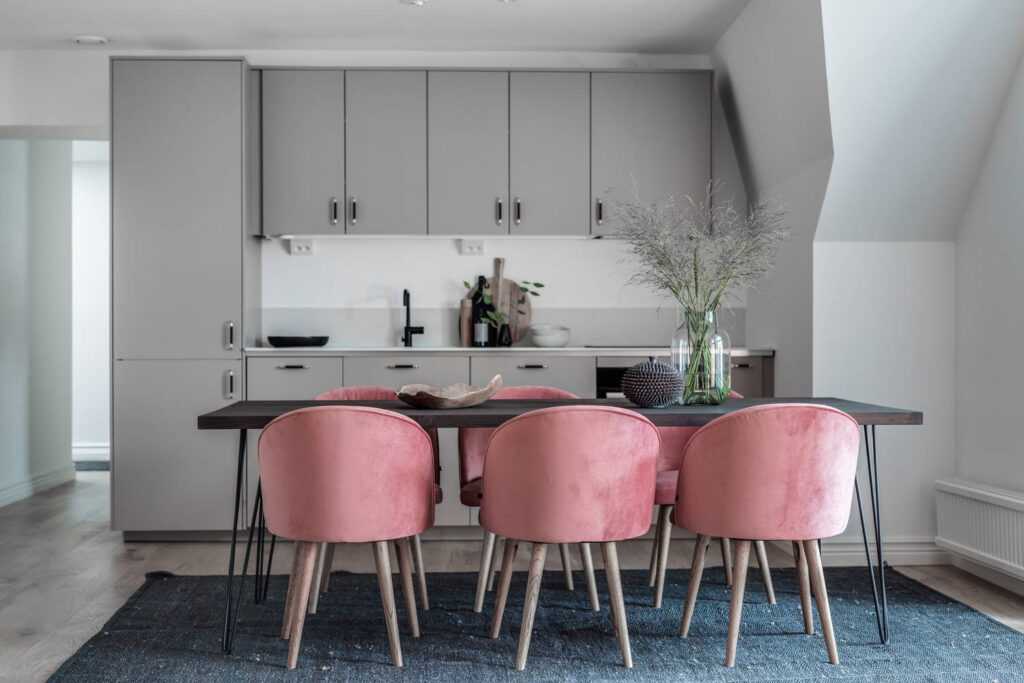 Розовый гарнитур великолепно сочетается с обеденной мебелью из древесины и ее имитации. Для кухонь в современном оформлении отлично подойдут пластиковые столы и стулья, которые могут иметь такую же расцветку. Главной задачей при выборе кухонной мебели является гармоничное сочетание палитры всех элементов помещения и гарнитура.