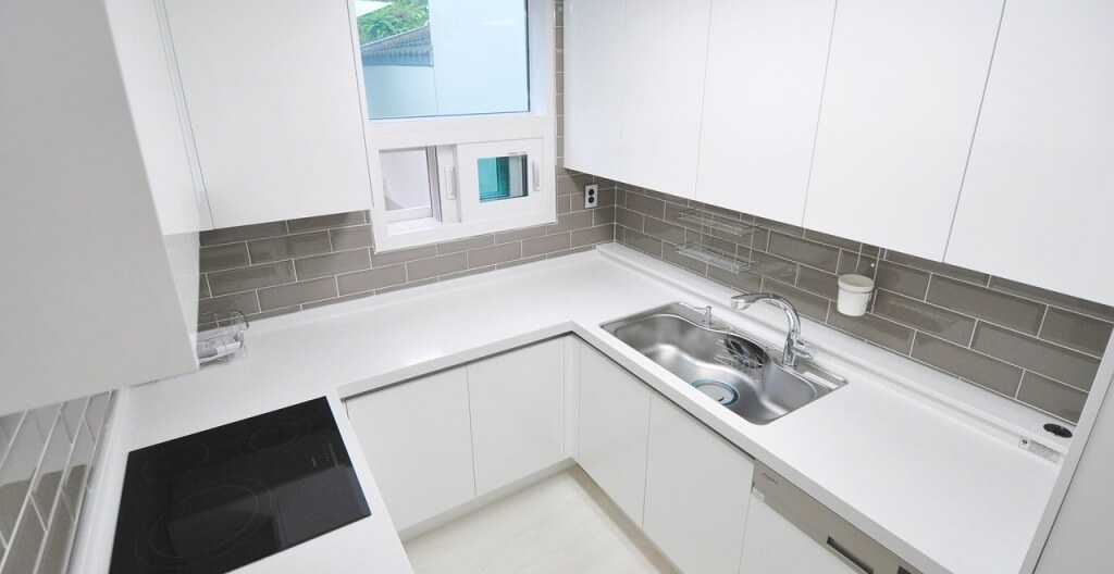 По мнению большинства хозяек это наиболее практично. В этом случае обязательно использование мебели со светлыми фасадами.