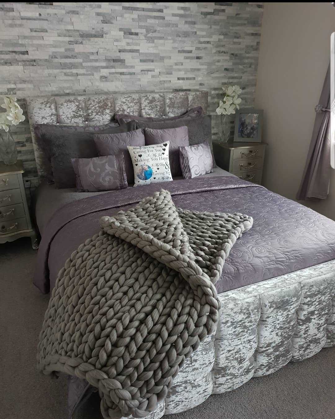 Фиолетовый цвет-компаньон в спальне в бархате.