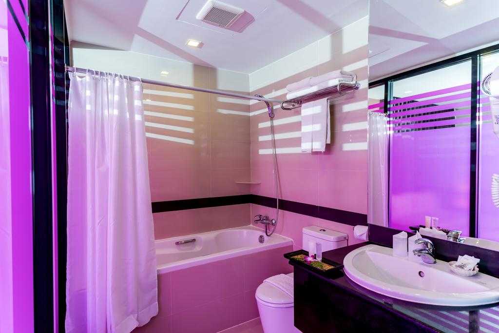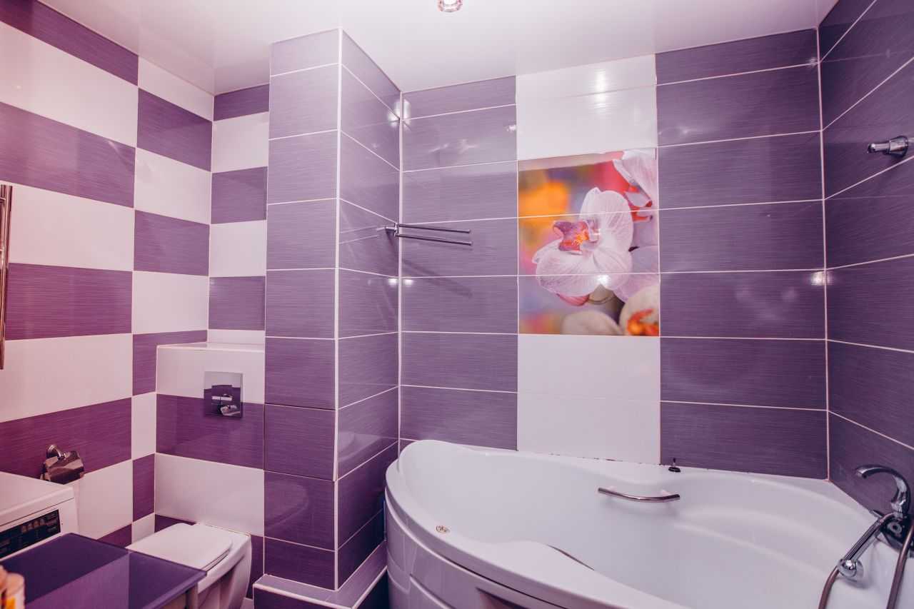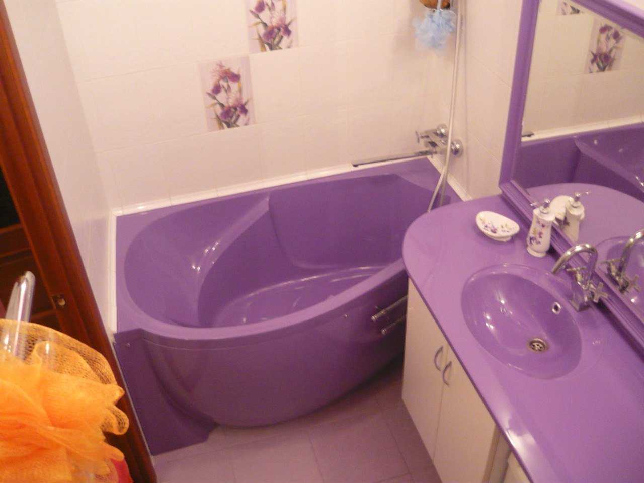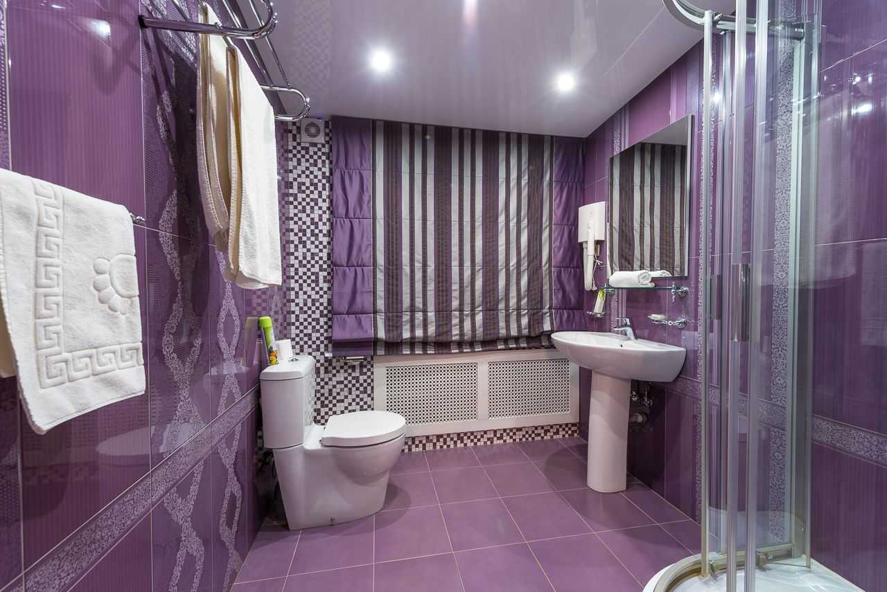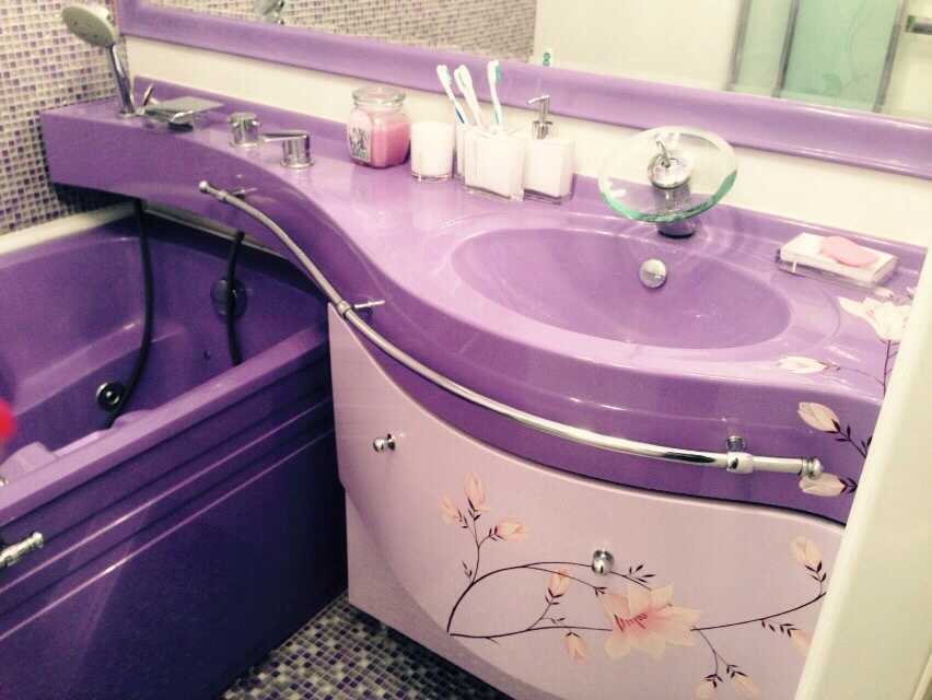 Фиолетовая ванная комната актуальна как для мужчин, так и для женщин. Если вы хотите сделать более нежную и романтическую атмосферу – используйте мебель белых, светло-фиолетовых или розовых тонов. Более грубого, но в то же время стильного оформления можно добиться, обставив ванную комнату мебелью, имитирующей красное дерево с металлической отделкой.