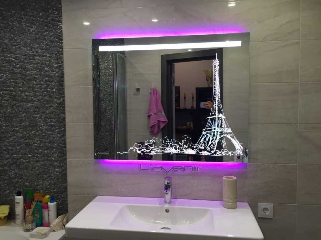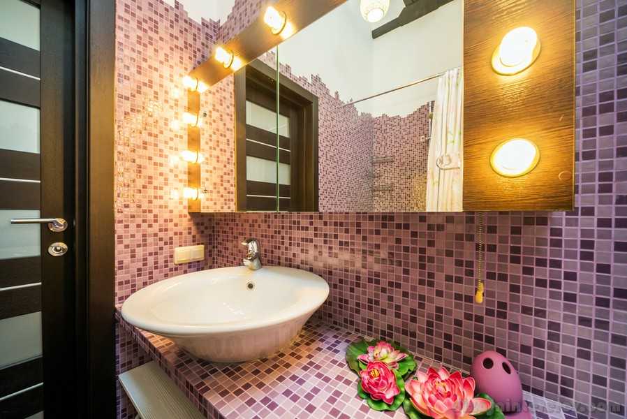 Фиолетовый цвет прекрасно дополняет освещение в приглушенных тонах. Наилучшее решение – несколько светильников, установленных по периметру потолка. Они произведут достаточное количество света и подчеркнут при этом стилистику интерьера. Актуальным будет также повесить несколько бра либо приобрести зеркало с подсветкой.