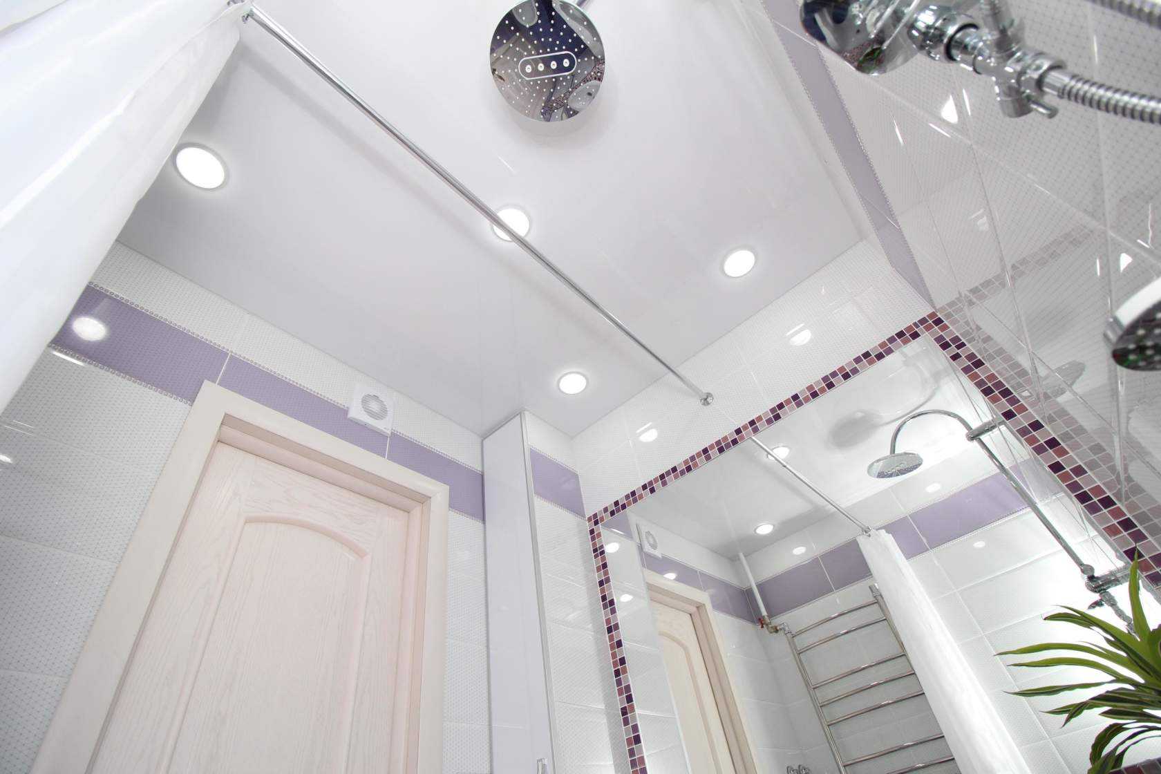 В редких случаях потолок оформляют зеркальными поверхностями, но это довольно дорогой вид облицовки, к тому же, процесс оформления трудоемкий. Поверхность зеркал будет постоянно запотевать и потребует ежедневной уборки. Неплохой и экономичный вариант – пластиковая вагонка. Она имеет большой спектр оттенков, легко моется и позволяет обустроить систему точечных светильников, ведь качественное освещение для ванной просто необходимо (но об этом позже).