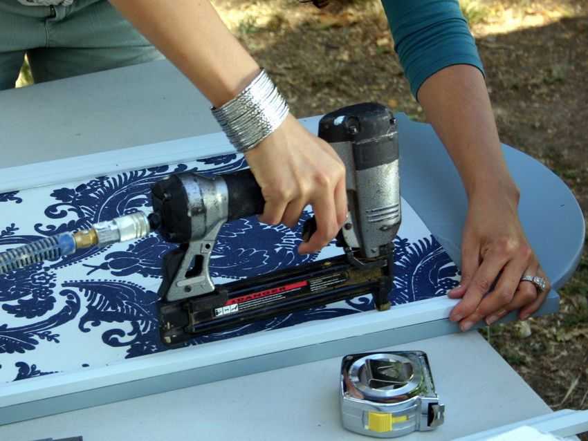 - Закрепите ткань на раме сверху при помощи строительного степлера. Натягивайте ткань и следите за тем, чтобы она не пошла волнами. Когда закрепите верх, приступайте к закреплению нижней части, а затем уже крепите ткань по бокам.