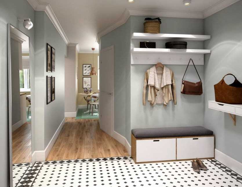 Интерьер прихожей в скандинавском стиле покоряет аккуратностью, сдержанностью и лаконичностью. Белоснежные стены и потолок создают фон для серой или черно-белой мебели, имеющей компактные размеры