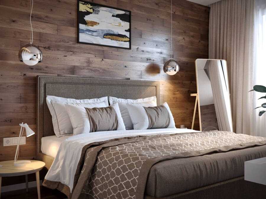 В маленькой спальне найдется место для удобной кровати и двух аккуратных тумб. Установите на них яркие лампы, и помещение не будет казаться мрачным, несмотря на его небольшие размеры.