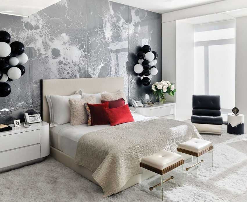 Современным направлениям, таким как минимализм, модерн, хай-тек присущи сдержанные черты оформления. Стены спальни можно полностью облачить в однотонную «одежку» или сделать единичный акцент, оклеив одну из плоскостей обоями с монохромным рисунком, абстракцией.