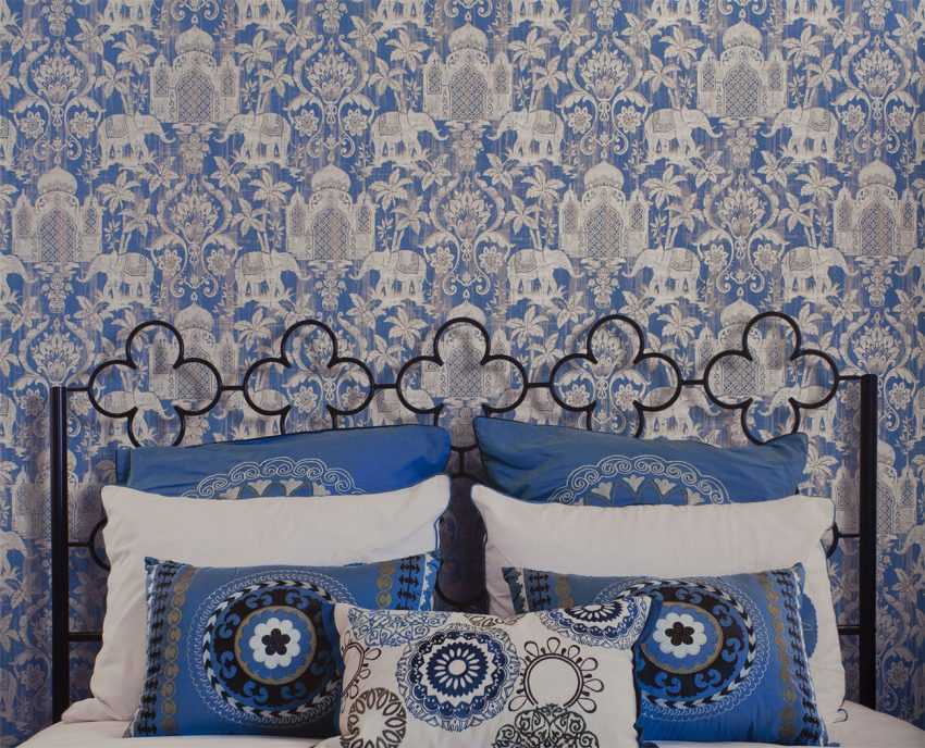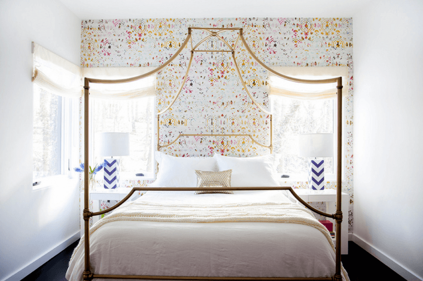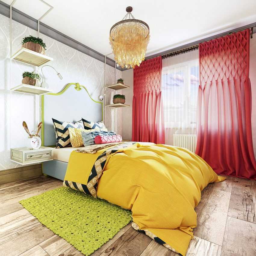 В ярких тонах специалисты рекомендуют оформлять стену за кроватью, чтобы она не отвлекала на себя внимание засыпающего человека