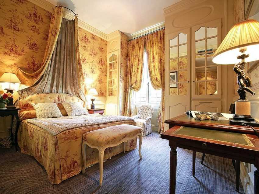 Обязательно наличие антиквариата, камина, колон, люстр. На полу мрамор или дорогой паркет. Из всех стилей дизайна интерьера спальни данная версия выделяется внушительными денежными затратами.