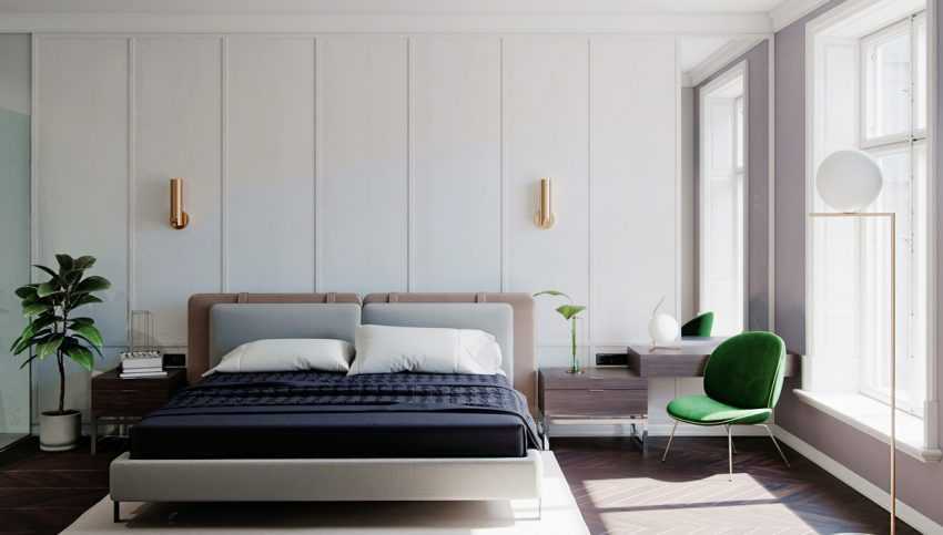 Лаконичность линий. В такой интерьер следует подбирать мебель строгих форм, без излишнего декора. Приветствуется высокое, но сдержанное изголовье кровати, практичная немаркая обивка стульев, прямоугольные комоды.