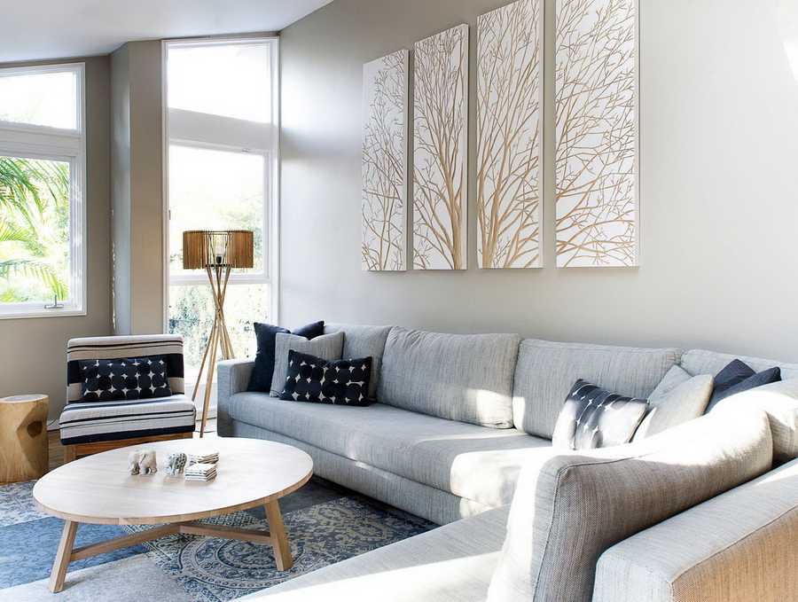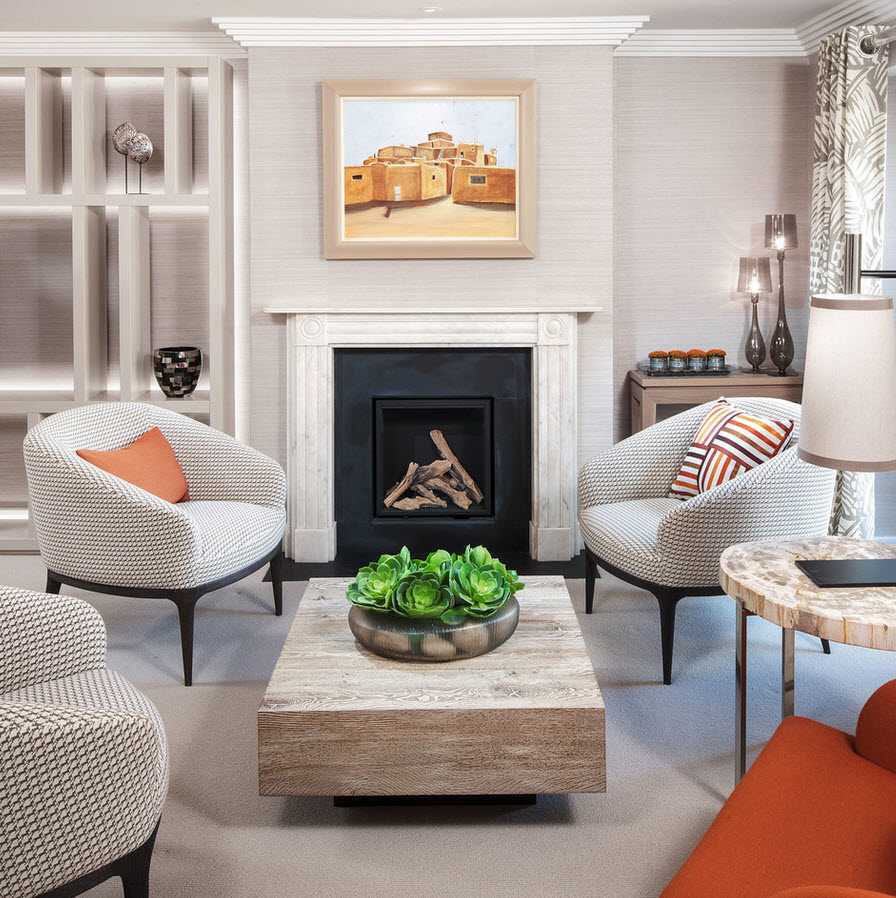 Всегда свежо в современной гостиной выглядят аксессуары и мебель со шлифованными и неровными поверхностями