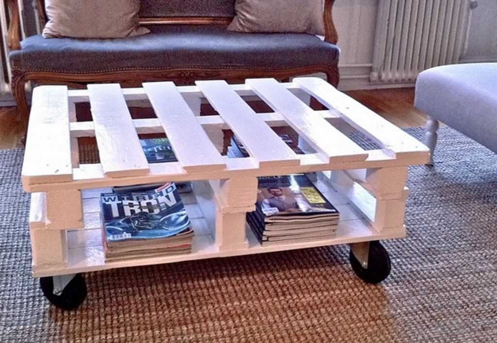 Разрежьте поддоны на части и обработайте наждачкой, скрепите так, чтобы получился столик. После из бруса вырежьте ножки или прикрепите колесики. Поверх покрасьте краской или другим отделочным материалом.