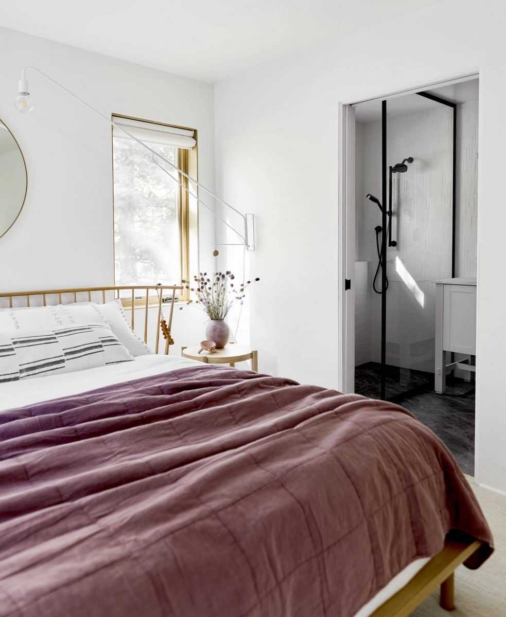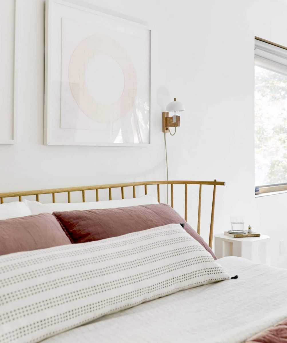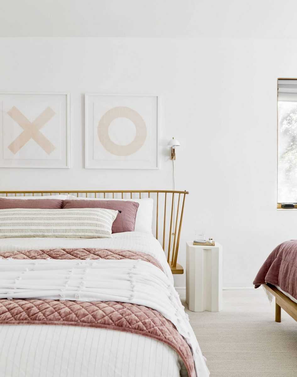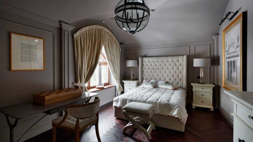 Предвкушая вопрос — нет, это не будет выглядеть неуютно. Это очень простое правило: отделка с прямоугольными правильными формами, смягчение и плавные линии за счёт текстиля, штор и мягкой мебели, которых в спальне хоть отбавляй.