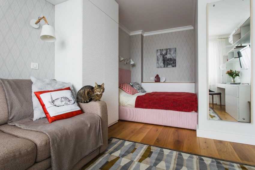 Какие-то особые требования по отделке отсутствуют, но важно помнить, что вертикальная полоска удлиняет пространство, горизонтальная делает его шире, а вот крупные рисунки, наоборот, уменьшают имеющуюся площадь. Пол лучше всего оформить ламинатом или паркетом, а мягкий коврик использовать только в спальной зоне или месте для отдыха