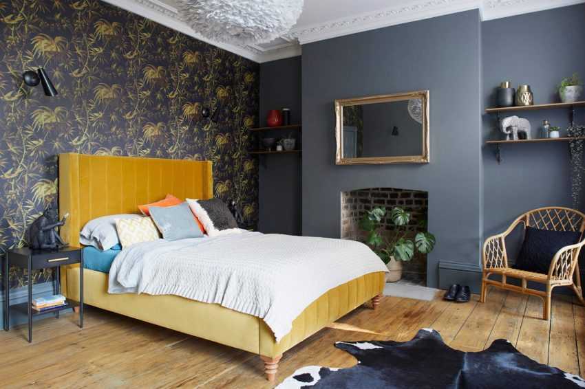 В ярких тонах специалисты рекомендуют оформлять стену за кроватью, чтобы она не отвлекала на себя внимание засыпающего человека