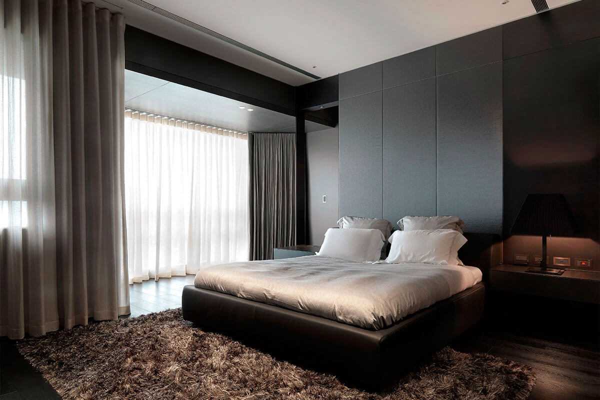 Однако не всем подходит такая цветовая гамма, поэтому дизайнеры нередко создают интерьеры с использованием других чистых цветов – красного, синего или зеленого. Как исключение, можно выбрать ковры или шторы с контрастным геометрическим рисунком. Чтобы обстановка спальни была более уютной, применяют оттенки серого.