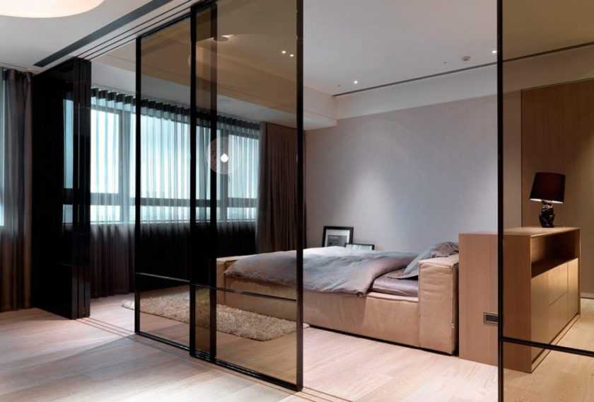 В целях разделения пространства на функциональные зоны можно применять перегородки из стекла или пластика, высокие шкафы, колонны с футуристическим оформлением и другие способы зонирования.