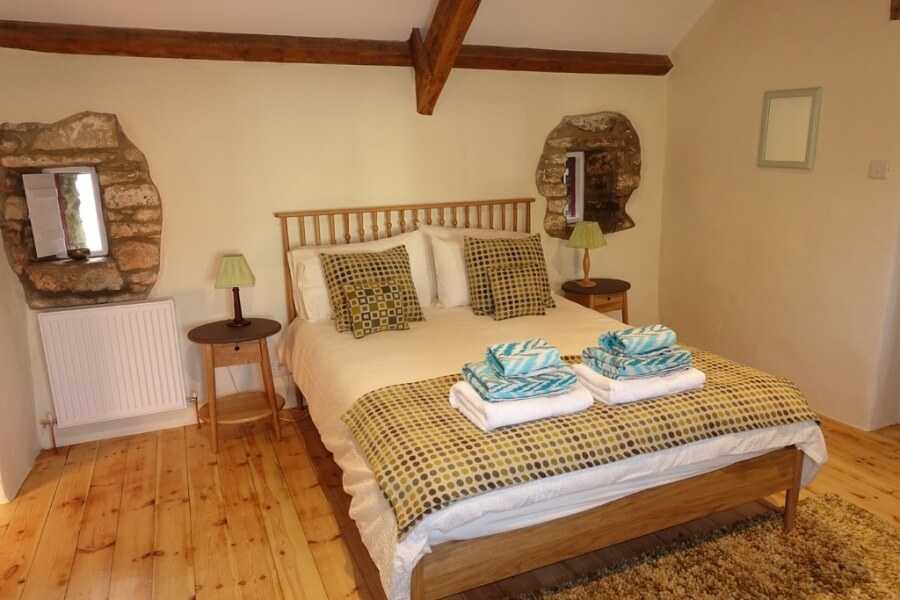 Особое внимание стоит уделить выбору текстиля — комплекту фланелевых пледов, постельного белья в оплетке, шерстяного одеяла с бахромой, так как спальня должна быть мягкой и уютной