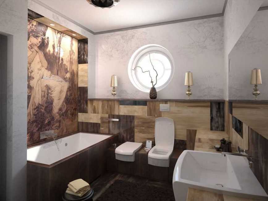 Сочетание винтажной мебели и ультрасовременной сантехники в интерьере с элементами арт-деко выглядит гармонично и привлекательно. Выгодно подчеркнуть обстановку поможет элегантная ванна на ножках, прямоугольный или овальный умывальник из искусственного камня, встроенный в тумбу.