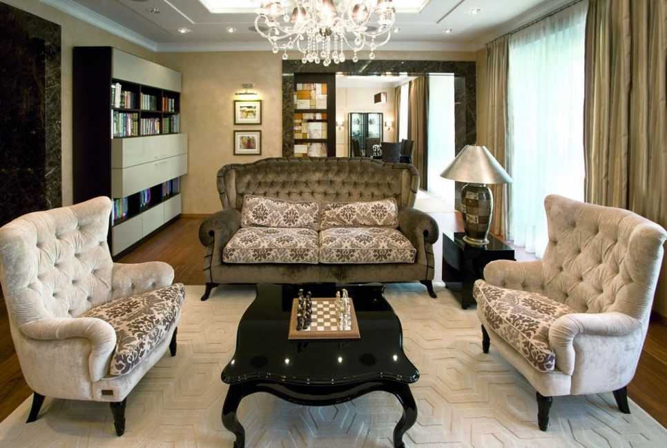 Многие предпочитают в таких комнатах некоторое осветление. Поэтому в идеале будет дополнить гостиную бежевым, кремовым или кофейным тоном. Его обычно применяют для отделки стен и потолков. Иногда он встречается и в декоре.